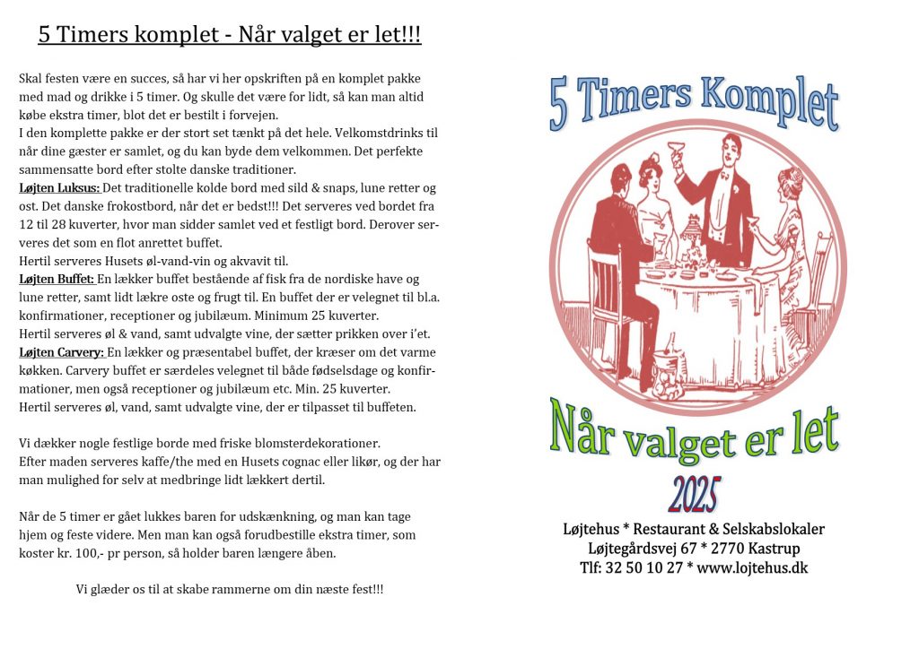 Skal festen være en succes, så har vi her opskriften på en komplet pakke med mad og drikke i 5 timer. Og skulle det være for lidt, så kan man altid købe ekstra timer, blot det er bestilt i forvejen.